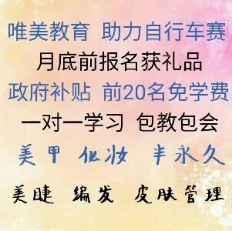 驚喜 驚喜 特大驚喜 唯美教育學(xué)校為迎接 邢臺自行車賽 特為愛美人士重推出以下助學(xué)活動: 凡在活動期間外地需住宿學(xué)習(xí)的學(xué)員報名,即可獲得免住宿費1 個月 凡在活動期間報名學(xué)習(xí)的寶媽,均可為自己親愛的寶寶獲得超級可愛書包1 個 凡在活動期間報名學(xué)習(xí)的單身女孩或已婚但未當(dāng)寶媽的學(xué)員,可獲得超級大超級可愛的1.6米泰迪熊或1.6米瞌睡熊毛絨玩具1 個(每個均有 個顏色可選哦) 活動時間:2017 年8 月11 日——2017年8 月31 日 只要你愛美 只要你愛好 只要你愛學(xué) 只要你喜歡 那麼就不要再猶豫了 機(jī)會不多,失不再來 心動不如行動,趕緊行動吧
