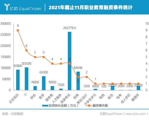 除了政策利好,職業(yè)教育亦受到資本青睞。截止11月,2021年已有云學堂、UMU互動學習平臺、課觀教育、三節(jié)課等多家職業(yè)教育相關企業(yè)獲得多輪融資,融資事件累計達56次,并迎來了傳智教育、職業(yè)教育兩家職業(yè)教育企業(yè)的上市,覆蓋職業(yè)教育中服務提供商和學習咨詢平臺。 根據(jù)億歐智庫數(shù)據(jù)顯示,2021年截止11月,職業(yè)教育融資事件中,A輪融資和并購項目數(shù)量最多超過行業(yè)整體的三分之一,而從細分的投資方向來看,企業(yè)培訓類企業(yè)在今年的融資較多,IT、招錄考試、財商和醫(yī)學類賽道也是資本市場較為活躍和關注的領域。