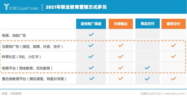以就業(yè)為導向的人才適應性提升 職業(yè)教育作為以就業(yè)為導向的教育方式,其適應性不僅只體現(xiàn)在人才培養(yǎng)上,還在于人才的管理和服務。 在人才培養(yǎng)的學歷階段,職業(yè)院校是主要的培養(yǎng)方,2021年10月中共中央辦公廳、國務院辦公廳印發(fā)《關于推動現(xiàn)代職業(yè)教育高質(zhì)量發(fā)展的意見》就加快構建現(xiàn)代職業(yè)教育體系做出進一步的部署。人才適應能力的提升一方面來自于職業(yè)教育體系和普通教育體系的橫向融通和縱向貫通,打通升學渠道,另一方面則是面向市場,以企業(yè)崗位需求為目標,通過綜合的育人機制,改善職業(yè)教育學歷階段的人才供給結(jié)構。 企業(yè)則是通過校企合作和自主培養(yǎng),輸出資金、技術、實踐案例,吸納專業(yè)人才,強化品牌認知。 隨著靈活用工方式的出現(xiàn)從人員招聘、用工管理到員工技能培訓、權益保障都有對應的服務提供,人與崗位,人才與企業(yè)之間匹配的靈活性增加、時效性增強,帶來了人才服務效率的整體提升。 在線化職業(yè)教育服務交付 在線化服務交付,顧名思義,教育的在線化是社會經(jīng)濟高質(zhì)量飛躍、互聯(lián)網(wǎng)等技術成熟發(fā)展的必然結(jié)果,在不斷提高的互聯(lián)網(wǎng)普及率和新冠疫情的沖擊下,職業(yè)教育的全面在線化為行業(yè)升級的新成果。而招生營銷和教學形式的全面升級是職業(yè)教育在線化后表現(xiàn)最為突出的兩方面。
