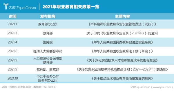 2021年,全國職業(yè)教育大會的召開,會議對職業(yè)教育工作做出重要指示,強調(diào)在全面建設社會主義現(xiàn)代化國家新征程中,職業(yè)教育前途廣闊、大有可為,無不體現(xiàn)出我國當前對職業(yè)教育的重視。