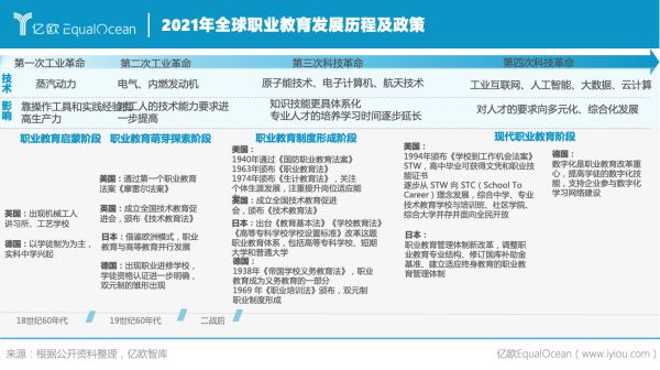 第一次工業(yè)革命后,以學徒制為主的職業(yè)教育萌芽出現(xiàn),主要以英國、德國職業(yè)教育體系為代表;二戰(zhàn)后,各國產(chǎn)業(yè)結(jié)構呈現(xiàn)多元豐富的發(fā)展趨勢,職業(yè)教育逐步實現(xiàn)制度化、體系化發(fā)展,英美日德各自頒布職業(yè)教育相關法律促進職業(yè)教育規(guī)范化發(fā)展;信息化時代來臨,信息網(wǎng)絡數(shù)字化為主的職業(yè)教育培訓迎來新的發(fā)展期。