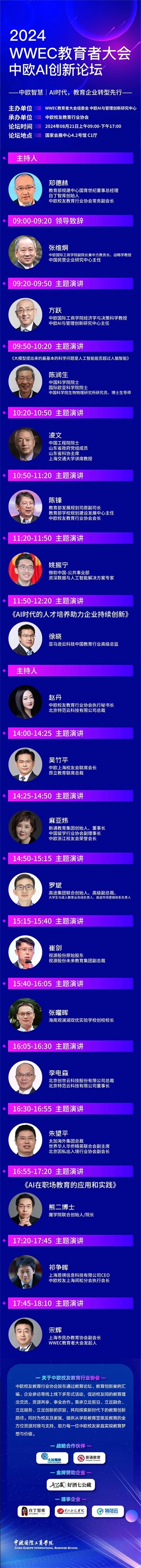 WWEC|中歐AI 創(chuàng)新論壇 主題:中歐智慧|AI 時代,教育企業(yè)轉型先行 時間:8月21日(周三) 9:00-17:30 地點:國家會展中心(上海)4.2號館【C1廳】? (上海市崧澤大道333號) 主辦:中歐AI與管理創(chuàng)新研究中心 WWEC教育者大會組委會 聯(lián)合主辦:中歐校友教育行業(yè)協(xié)會 協(xié)辦單位:中歐上海校友會 中歐北京校友會 中歐校友數字生態(tài)俱樂部 支持單位:新通教育