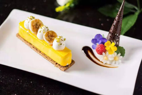 說干就干,9天的時間,我每天一有空就研究參賽作品,時常練習到深夜,從口味、感觀、藝術(shù)造型、盛器的擬定等方面入手,經(jīng)過無數(shù)次的試制,最后決定以“檸檬乳酪蛋糕”“焦糖香蕉輕慕斯”兩款作品參賽。9月23日上午,在總決賽現(xiàn)場歷經(jīng)一個半小時的緊張制作,我完成了比賽,終于可以松一口氣。