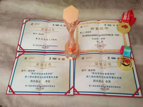 頒獎現(xiàn)場,當聽到自己榮獲“全國烹飪技能競賽西式面點季軍”、“西式面點金獎”,并被授予“餐飲業(yè)技能人才”稱號時,我心里激動不已。接過獎杯,激動的淚水在眼圈里打轉(zhuǎn),因為我知道這個獎杯來之不易!
