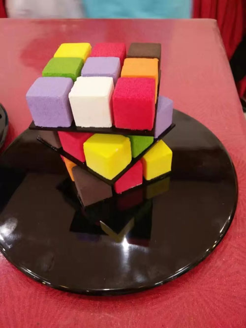 我非常珍惜這次參賽機會,一絲也不敢懈怠。每天都在參賽作品的口味和外形上不斷創(chuàng)新,爭取用最好的作品參加總決賽。但就在我努力準備參賽作品時,意想不到的事情發(fā)生了。我突然接到通知:因設(shè)備問題,總決賽取消烘焙項目的比賽。如果想繼續(xù)參賽,可以轉(zhuǎn)成西點項目。掛斷電話我心里在想:距離比賽還有9天的時間,參加西點項目的比賽我能行嗎?要放棄嗎?一系列的問號在腦子里出現(xiàn)。我找到自助餐成亮亮廚師長求助,他聽后鼓勵我說:“你行,以你的工作經(jīng)驗和技術(shù)水平我對你很有信心?!痹谒墓膭钕挛乙闳桓膱笪鼽c項目比賽。