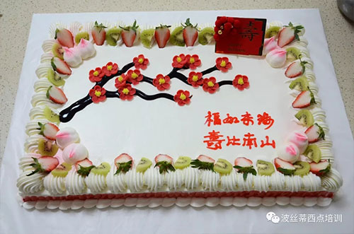 波絲蒂西點培訓(xùn)學(xué)校專業(yè)裱花班的李青老師精心為老人制作生日蛋糕
