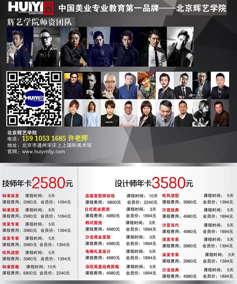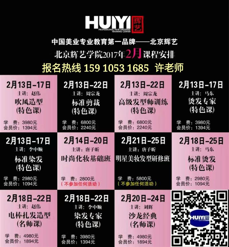 2017年北京輝藝美發(fā)化妝學院2月13日開課,5科課程接受報名【吹風造型】【標準剪裁】【高級發(fā)型師訓練】【燙發(fā)專家】【標準染發(fā)】每月循環(huán)開課10門以上,更多資訊請?zhí)砑游?.