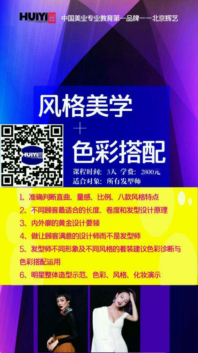 北京輝藝學院 4月11-13號《風格美學與色彩搭配》開課 學費2800元/人 風格美學課程內容: 1、準確判斷直曲、量感、比例、八大風格特點 2、不同顧客最適合的長度、卷度和發(fā)..