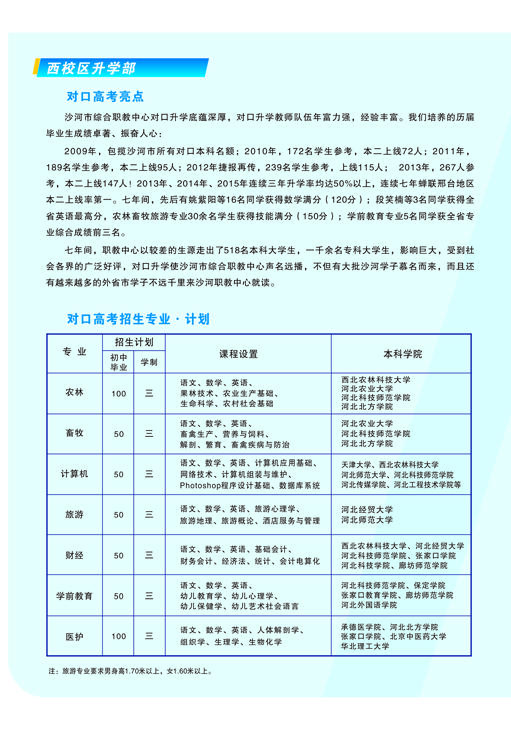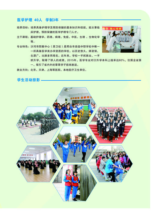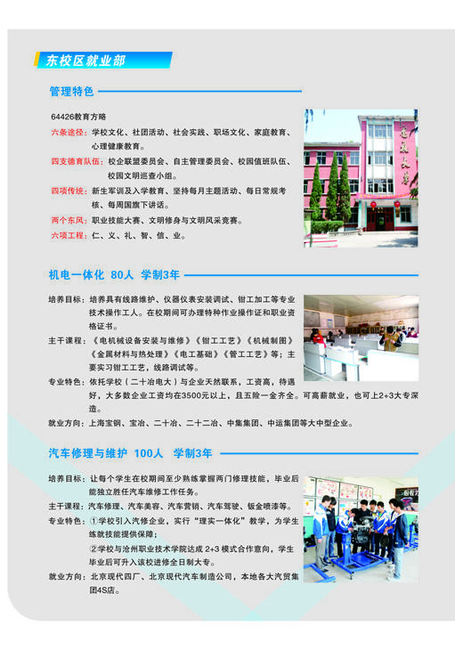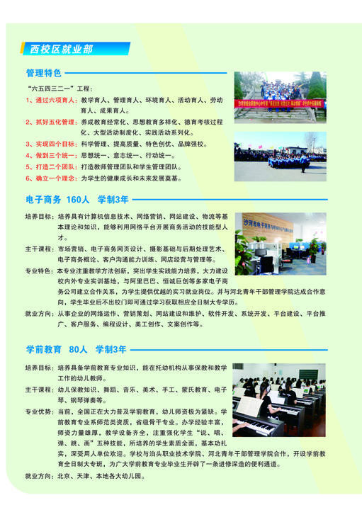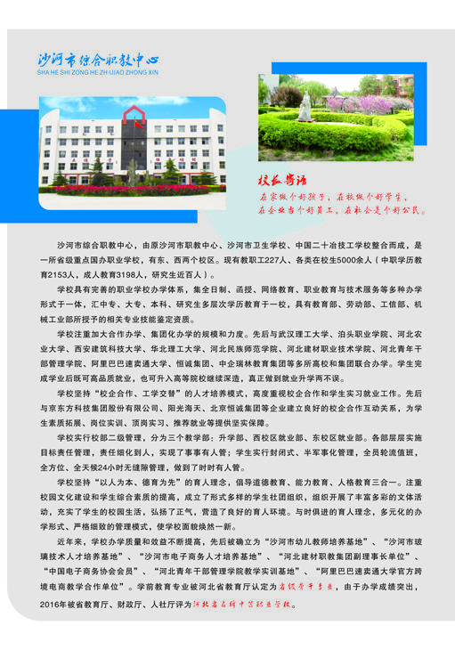 河北省沙河市綜合職教中心介紹 河北沙河市綜合職教中心始建于1995年,2011年7月沙河市人民政府將原二十冶技校(含邢臺(tái)機(jī)械電子工程學(xué)校)、原沙河市衛(wèi)生學(xué)校合并到沙河市綜合職教中心。 整合后的職教中心以“先搭建框架,再豐滿血肉”為辦學(xué)思路,通過(guò)開展多資質(zhì)、多層次、多形式、多類別辦學(xué),逐步構(gòu)建起全日制學(xué)歷教育、成人教育和職業(yè)培訓(xùn)并舉的立體職教框架,形成了學(xué)歷教育與職業(yè)培訓(xùn)規(guī)模大體相當(dāng),全日制中職教育與成人教育規(guī)模大體相當(dāng)、升學(xué)教育與就業(yè)教育規(guī)模大體相當(dāng)?shù)霓k學(xué)格局。 河北省沙河市綜合職教中心占地99101平方米(148.6畝),分為東、西兩個(gè)校區(qū),總建筑面積為..