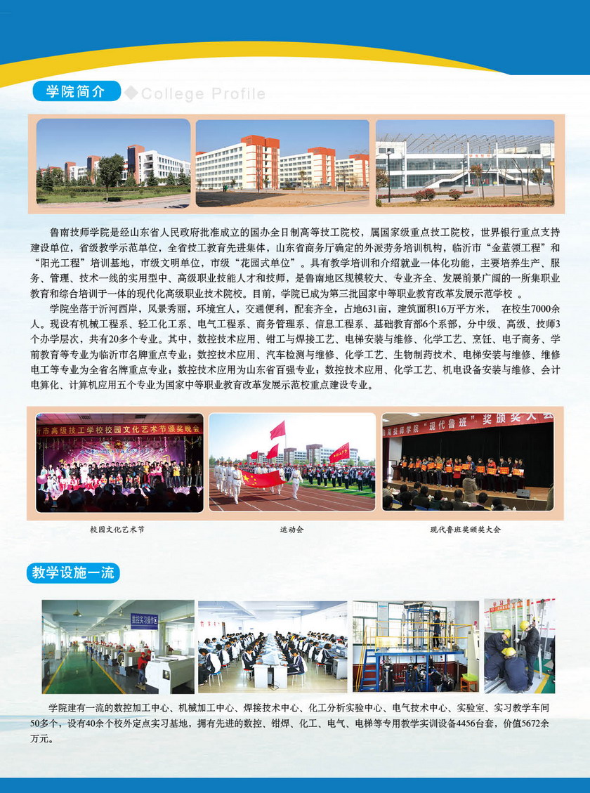 同類(lèi)型學(xué)校推薦 臨沂電力學(xué)校招生簡(jiǎn)章 山東煤炭技師學(xué)院招生簡(jiǎn)章 山東省城市服務(wù)技師學(xué)院魯州學(xué)院招生簡(jiǎn)章 臨沂育杰職業(yè)中等專業(yè)學(xué)校招生簡(jiǎn)章 臨沂沂蒙國(guó)防教育基地招生簡(jiǎn)章 一、學(xué)院簡(jiǎn)介 魯南技師學(xué)院是國(guó)家級(jí)重點(diǎn)技工院校、國(guó)家中等教育改革發(fā)展示范學(xué)校,是一所專業(yè)齊全、發(fā)展前景廣闊的現(xiàn)代化職業(yè)技術(shù)院校。學(xué)院位于臨沂市區(qū)濱河大道與羅程路交會(huì)處,總占地面積631畝,總建筑面積16萬(wàn)平方米,固定資產(chǎn)2.6億元?,F(xiàn)有專、兼職教師214人,其中:省、市首席技師12人,市級(jí)及省級(jí)專業(yè)(學(xué)科)帶頭人27人,“一體化”教學(xué)名師92人?,F(xiàn)有在校生6000余人,其中全日制在校生近5000人,成..