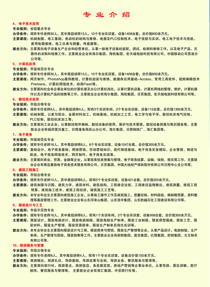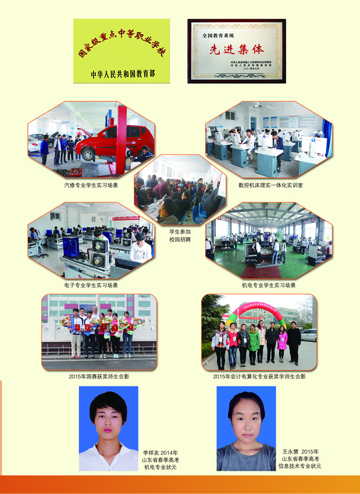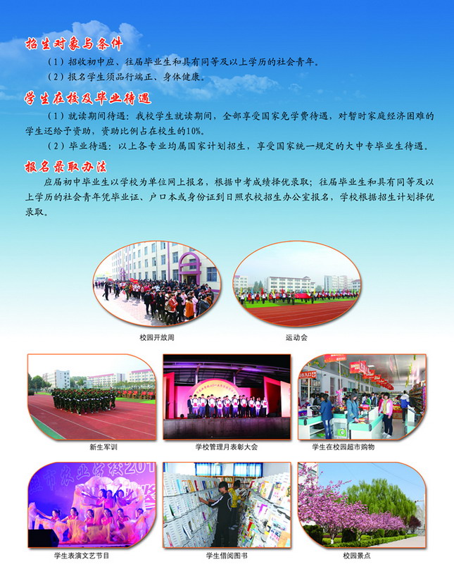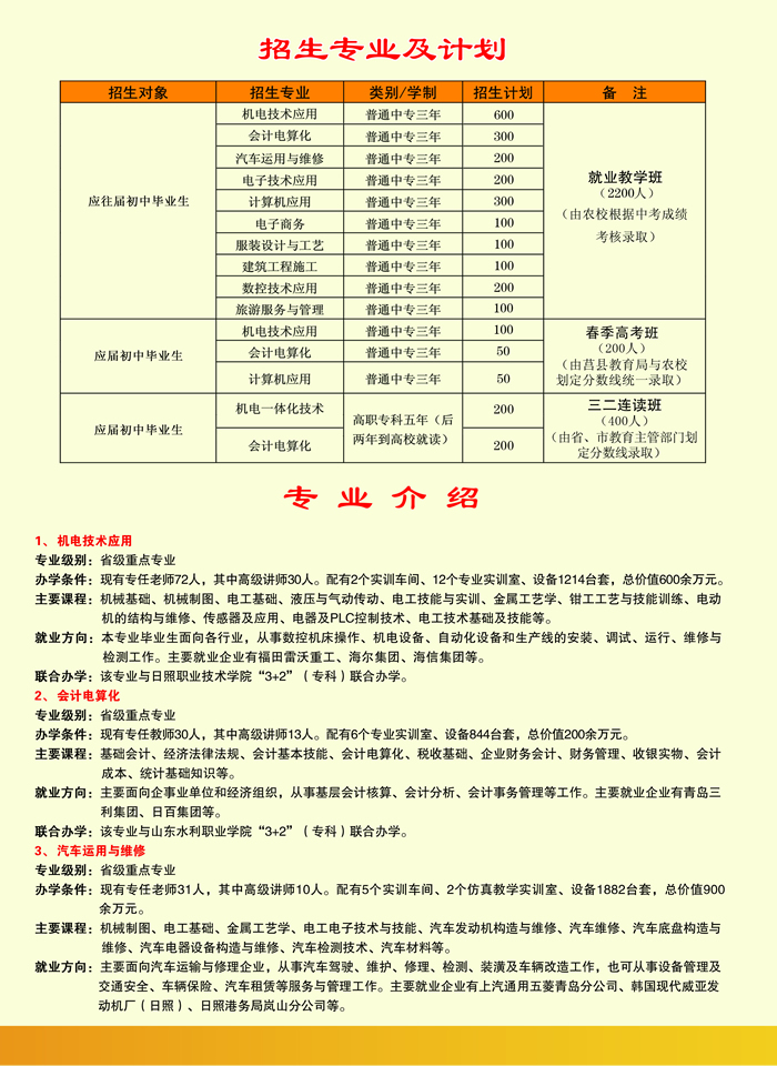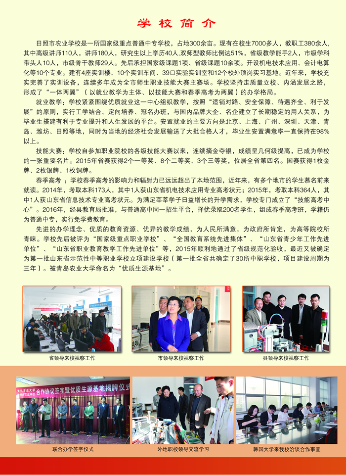 日照市農業(yè)學校(莒縣職教中心)是日照市人民政府舉辦的一所普通中等專業(yè)學校,始建于1979年,1995年被教育部認定為國家級重點職業(yè)學校,2005年被教育部確定為國家級電工電子與自動化實訓基地。 學校地處國家AAA級旅游區(qū)浮來山腳下,占地300畝,建筑面積8萬平方米,在校生4000余人(其中“三二”連讀大專班學生810人),教職工450人。專任教師中碩士研究生以上學歷20人,高級職稱105人。現(xiàn)建有1個校內綜合實訓車間、18口實驗實習室和12個校外頂崗實習基地。 學校緊緊圍繞經濟建設與社會發(fā)展,實行按需辦學,定向培養(yǎng)?,F(xiàn)開設9個專業(yè),其中機電技術及應用、電子技術及應用、計算機技..