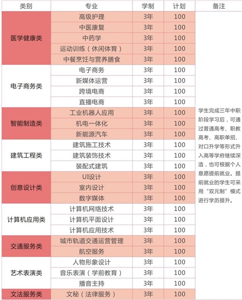 學(xué)校下設(shè)專業(yè): ——醫(yī)學(xué)健康類(高級(jí)護(hù)理、中醫(yī)康復(fù)、中藥學(xué)、運(yùn)動(dòng)訓(xùn)練、中餐烹飪與營(yíng)養(yǎng)膳食)——電子商務(wù)類(電子商務(wù)、新媒體運(yùn)營(yíng)、跨境電商、直