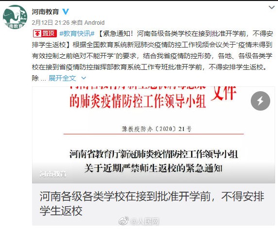 【開學(xué)時(shí)間待定!河南各地不得安排學(xué)生返校】 河南教育緊急通知:各地、各級(jí)、各類學(xué)校在接到省疫情防控指揮部教育系統(tǒng)工作專班批準(zhǔn)開學(xué)前,不得安排