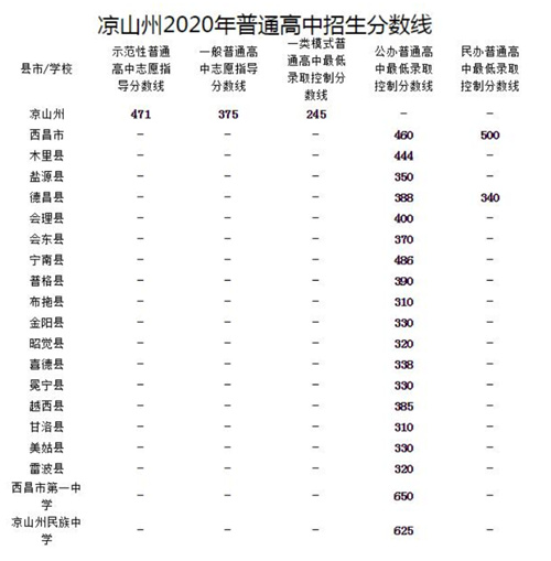2021年四川涼山中考錄取分?jǐn)?shù)線暫未公布,小編為大家整理了2020年分?jǐn)?shù)線作為參考。2021年分?jǐn)?shù)線將在官方公布后進(jìn)行更新,請(qǐng)大家持續(xù)關(guān)注。 2020年分?jǐn)?shù)