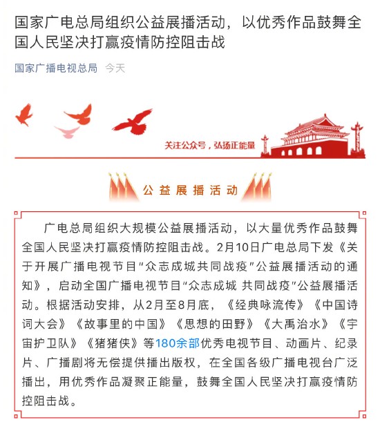 據(jù)國家廣電總局,日前已啟動全國廣播電視節(jié)目“眾志成城 共同戰(zhàn)疫”公益展播活動。根據(jù)安排,《大禹治水》《宇宙護(hù)衛(wèi)隊》《豬豬俠》等180余部、共近2000小時的優(yōu)秀電視節(jié)目、動畫片、紀(jì)錄片、廣播劇將無償提供播出版權(quán),在全國各級廣播電視臺廣泛播出。