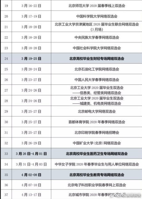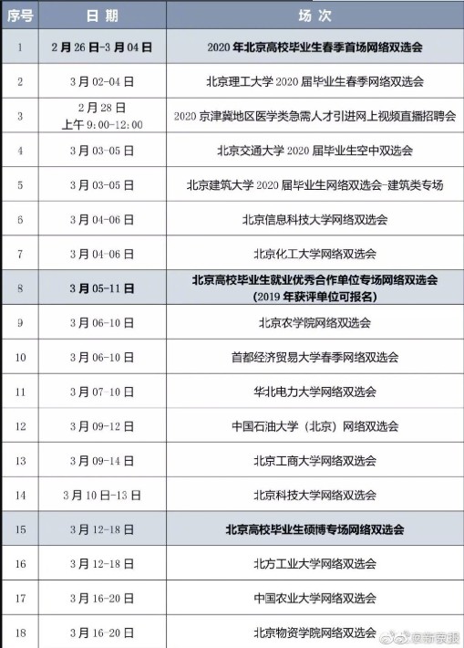 自2020年2月26日起,不同主題的網(wǎng)絡(luò)雙選會將陸續(xù)舉辦,每場雙選會持續(xù)時(shí)間為3-7天。