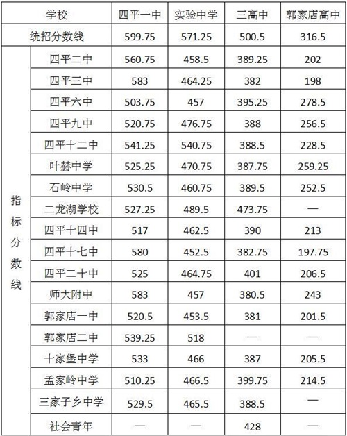 四平市第一高級(jí)中學(xué)599.75;四平市實(shí)驗(yàn)中學(xué)571.25;四平市第三高級(jí)中學(xué)500.5;郭家店高級(jí)中學(xué)316.50。
