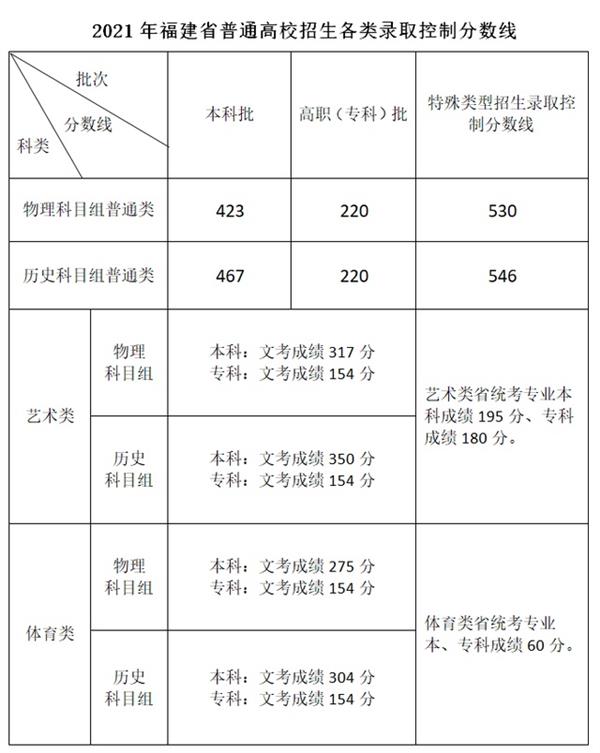 2021年福建省普通高校招生錄取控制分?jǐn)?shù)線