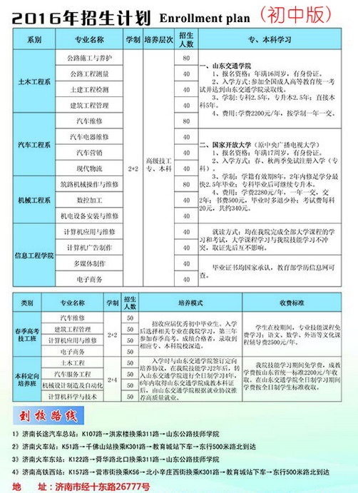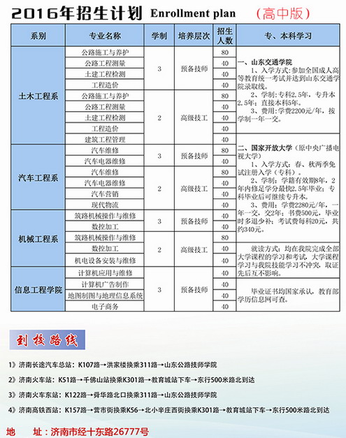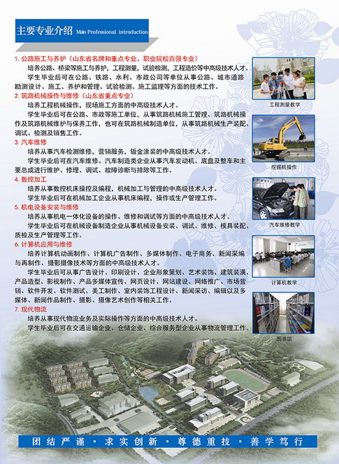 山東公路技師學(xué)院簡(jiǎn)介 山東公路技師學(xué)院直屬于山東省交通運(yùn)輸廳,是一所以培養(yǎng)交通行業(yè)高技能人才為主,集職工培訓(xùn)、成人教育、技能鑒定、駕駛培訓(xùn)和智慧交通技術(shù)應(yīng)用與試驗(yàn)于一體的綜合性公辦全日制技師學(xué)院。 學(xué)院目前兩地三區(qū)辦學(xué),主校區(qū)、無(wú)影山校區(qū)和德州校區(qū),其中主校區(qū)坐落在濟(jì)南市經(jīng)十東路,交通便利,設(shè)施設(shè)備先進(jìn)齊全,環(huán)境優(yōu)美??傉嫉孛娣e700余畝,建筑面積16萬(wàn)平方米,現(xiàn)有教職工300余人,在校生達(dá)12000余人。學(xué)院設(shè)有公路工程系、運(yùn)輸工程系、汽車工程系、智能控制系、信息與管理工程系、基礎(chǔ)部、智慧交通技術(shù)應(yīng)用與試驗(yàn)中心五系一部一中心,常設(shè)專業(yè)37個(gè)。 學(xué)院19..