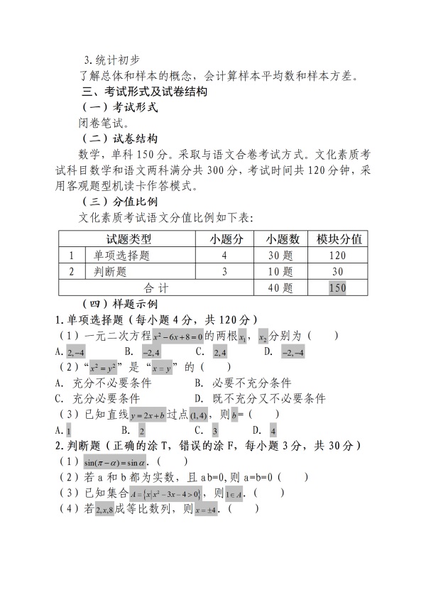 單招數(shù)學學科考試旨在測試中學數(shù)學基礎知識、基本技能、基本方法,考查數(shù)學思維能力、歸納抽象、符號表示、運算求解以及運用所學數(shù)學知識和方法分析問題和解決問題的能力。復習考試范圍包括代數(shù)、三角、平面解析幾何和概率與統(tǒng)計初步四部分。